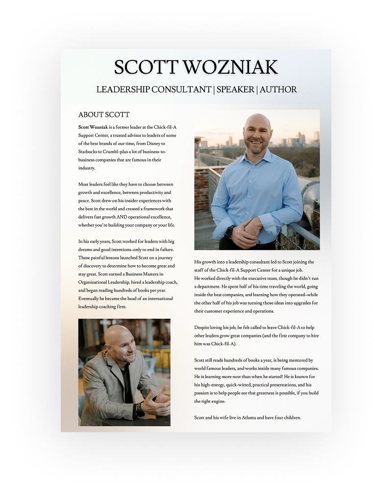 After years of helping great brands find and keep top talent, Scott Wozniak can teach you how to build an “Employee Engagement Engine”—how to put in place five systems that can get you the best people in your industry.
